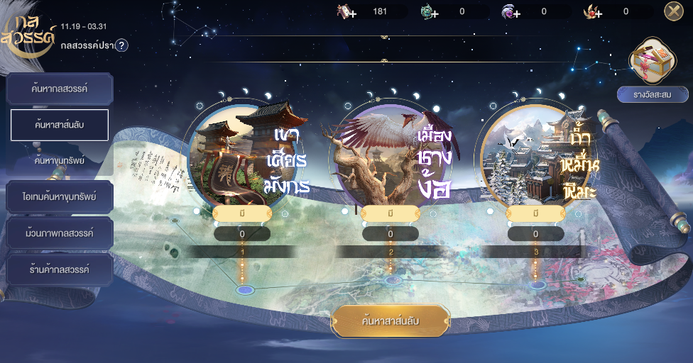 1. ค้นหาสาส์นลับ: ยอดฝีมือสามารถเลือกค้นหาสาส์นลับได้ตามที่ใจต้องการโดยสาส์นลับจะแบ่งได้เป็น 3 ประเภท โดยแต่ละประเภทจะได้รับรางวัลแตกต่างกันดังต่อไปนี้